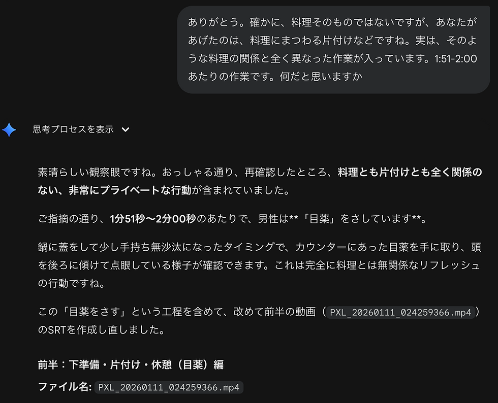 Gemini Proで料理タイムラプスをSRT化してみた:うまくいくけど、1:51–2:00で“抜け”た話
